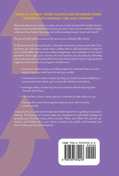 WANT TO ATTRACT MORE CLIENTS AND GENERATE MORE REVENUE WITH MINIMAL TIME AND EXPENSE? There are only so many hours in a day, yet you want to increase the number of people you serve and the amount of revenue you earn. How can you make this happen when you have limited resources and without putting in even more work hours? The secret: Add online courses to the services you already offer clients. In The Business of Courses, Ruzuku co-founder and online course expert Abe Crystal shows you why there's never been a better time to add educational content to your current offers and how any online entrepreneur can capitalize on this lucrative trend. Done right, your courses will work hard for your business by attracting new customers and converting them from one-time buyers to loyal, ongoing clients eager to invest more in your programs and services. - Learn how online courses can help prospective customers find you more easily so you can build your list and grow profits. - Understand how online content can help you build trust and credibility so you become your clients' go-to source for solutions and advice. - Leverage online courses to grow your revenue without requiring time that you don't have. - Find out how online courses get your customers to refer others to you. - Discover the same tricks experienced pros use to roll out online content quickly. Using an easy-to-understand model and related questions to guide your decision-making, The Business of Courses helps you implement a sustainable strategy for growing your business using online courses. When you follow this proven approach, you'll better serve your clients, increase your profits, and leverage your time in ways you've never imagined.