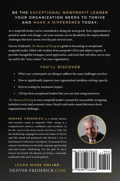 Be the exceptional nonprofit leader your organization needs to thrive and make a difference today. As a nonprofit leader, you're committed to doing the most good. Your organization is poised to make real change-yet your mission can be derailed by the unprecedented challenges that have arisen over the past several years. With no playbook to go by, how can you ensure that you're making the right calls for the organization and the people you serve? Denver Frederick is a trusted advisor to nonprofit CEOs. He has spent countless hours curating a guide to becoming an exceptional nonprofit leader. It is a resource filled with wisdom from subject experts and the most influential people in philanthropy. Culled from his longtime radio show and popular podcast of the same name, The Business of Giving provides thoughtful strategies and novel approaches you need to step up and become the "sense maker" for your organization. You'll discover:What your counterparts are doing to address the same challenges you face. How to significantly improve your organization's problem-solving capacity. Keys to scaling for maximum impact. Obstacles that derail your decision-making process and how to get back on track. 7 distinguishing features that make tech-centered nonprofits stand out. 150 tips from exceptional leaders that you can start using tomorrow. The Business of Giving is every nonprofit leader's master class for successfully navigating turbulent social and economic times. In addition to providing fresh, actionable ideas, it will validate much of what you and your team are already doing. Read it now to make quick, sound decisions about your increasingly complex management challenges.