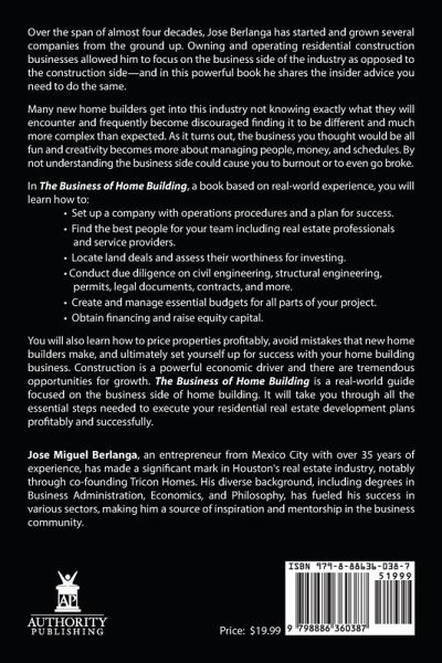 Over the span of four decades, Jose Berlanga has started and grown several companies from the ground up. Owning and operating residential construction businesses allowed him to focus on the business side of the industry, as opposed to the construction side-and in this powerful book he shares the insider advice you need to do the same. Many new home builders get into this industry not knowing exactly what they will encounter and frequently become discouraged, finding it to be different and much more complex than they expected. As it turns out, the business you thought would be all fun and creative becomes more about managing people, money, and schedules. But failing to understand the business side risks burnout or even bankruptcy. In The Business of Home Building, a book based on real-world experiences, you will learn how to: · Set up a company with clear operating procedures and a plan for success. · Find the best people for your team, including real estate professionals and service providers. · Locate land deals and assess their worthiness for investing. · Conduct due diligence on civil engineering, structural engineering, permits, legal documents, contracts, and more. · Create and manage essential budgets for all parts of your project. · Obtain financing and raise equity capital. You will also discover how to price properties profitably, avoid mistakes that new home builders often make, and ultimately set yourself up for success with your home-building business. Construction is a powerful economic driver and there are tremendous opportunities for growth. The Business of Home Building is a real-world guide focused on the business side of home building. It will take you through all the essential steps needed to execute your residential real estate development plans profitably and successfully.