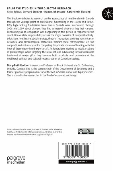This open access book contributes to research on the ascendance of neoliberalism in Canada through the vantage point of professional fundraising in the 1990s and 2000s. Fifty high-ranking fundraisers from across Canada were interviewed through 2008 and 2009 about changes they had witnessed since starting their careers. Fundraising as an occupation was burgeoning in this period in response to the devolution of state responsibility across the major domains of nonprofit activity: education, health care, social services, the arts, recreation, overseas humanitarian activities, and environmental protection. Welfare state retrenchment left the nonprofit and voluntary sector competing for private sources of funding with the help of these newly hired expert staff. As fundraisers worked to instill a culture of philanthropy, while targeting the ultra-rich and advocating for tax-favourable treatment of major gifts, they became both products and promoters of the neoliberal political and culturalreconstruction of Canadian society.