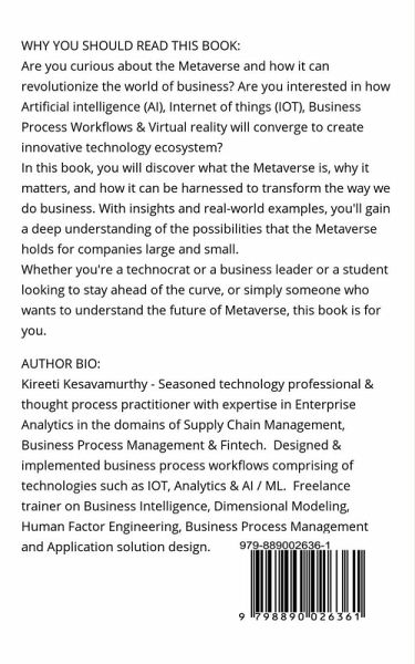 Are you curious about the Metaverse and how it can revolutionize the world of business? Are you interested in how Artificial intelligence (AI), Internet of things (IOT), Business Process Workflows & Virtual reality will converge to create innovative technology ecosystem? In this book, you will discover what the Metaverse is, why it matters, and how it can be harnessed to transform the way we do business. With insights and real-world examples, you'll gain a deep understanding of the possibilities that the Metaverse holds for companies large and small. Whether you're a technocrat or a business leader or a student looking to stay ahead of the curve, or simply someone who wants to understand the future of Metaverse, this book is for you. Don't miss out on the chance to learn about one of the most exciting developments in technology today which will redefine the possibilities of doing business. CONTENTS Metaverse and VR - AR - MR Technology needed to develop Metaverse Metaverse Platforms- Open vs. Closed Metaverse and its applications What's being done currently How to leverage Metaverse Supply Chain Management Forces of Supply and Demand CRM Fintech Automobile industry Corporate Metaverse HOW - Metaverse Business Models Strategy for commerce in & through Metaverse Monetising with Metaverse Governance - Metaverse Is it worth investing in Metaverse? Industrial metaverse Exploratory metaverse Persistent metaverse Metaverse & AI Metaverse as a Service Challenges