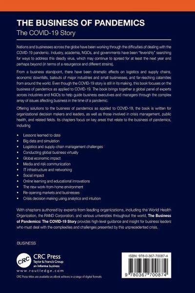 Nations and businesses across the globe have been working through the difficulties of dealing with the COVID-19 pandemic. Industry, academia, NGOs, and governments have been "feverishly" searching for ways to address this deadly virus, which may continue to spread for at least the next year and perhaps beyond (in terms of a resurgence and different strains). From a business standpoint, there have been dramatic effects on logistics and supply chains, economic downfalls, bailouts of major industries and small businesses, and far-reaching calamities from around the world. Even though the COVID-19 story is still in its making, this book focuses on the business of pandemics as applied to COVID-19. The book brings together a global panel of experts across industries and NGOs to help guide business executives and managers through the complex array of issues affecting business in the time of a pandemic. Offering solutions to the business of pandemics as applied to COVID-19, the book is written for organizational decision makers and leaders, as well as those involved in crisis management, public health, and related fields. Its chapters focus on key areas that relate to the business of pandemics, including Lessons learned to date Big data and simulation Logistics and supply-chain management challenges Conducting global business virtually Global economic impact Media and risk communication IT infrastructure and networking Social impact Online learning and educational innovations The new work-from-home environment Re-opening markets and businesses Crisis decision making using analytics and intuition With chapters authored by experts from leading organizations, including the World Health Organization, the RAND Corporation, and various universities throughout the world, The Business of Pandemics: The COVID-19 Story provides high-level guidance and insight for business leaders who must deal with the complexities and challenges presented by this unprecedented crisis.
