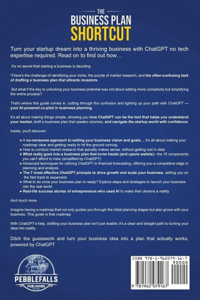 Turn Your Startup Dream into Reality with ChatGPT - No Tech Skills Needed! Starting a business can feel overwhelming-finding a niche, doing market research, and writing a business plan can seem confusing. But what if success isn't about adding complexity, but simplifying your journey? This guide shows how ChatGPT can become your AI-powered co-pilot in building your business, making planning easier and clearer. Here's what you'll discover:Set clear goals and vision for your business with practical steps to hit the ground running. Conduct market research effortlessly-no more getting lost in data. Craft a compelling business plan with 10 essential components (simplified with ChatGPT) to attract investors. Use ChatGPT for financial forecasting to stay ahead in planning and analysis. Discover 7 powerful ChatGPT prompts to scale your business fast. Learn launch strategies to bring your business from idea to reality. Real-life success stories of entrepreneurs leveraging AI to succeed. This guide grows with you, offering a practical roadmap from idea to execution. With ChatGPT by your side, creating your business plan becomes a breeze, paving a clear path to success. Stop guessing-turn your idea into a real business with the power of ChatGPT!