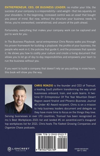 Entrepreneur, CEO, or business leader: no matter your title, the success of your company is a responsibility-and weight-that lies squarely on your shoulders. In the beginning, increased control was an asset that bought you peace of mind. But now, without the structure your business needs to thrive, you're overworked, overwhelmed, and unsure of the path ahead. Fortunately, everything that makes your company work can be captured and put to work for you. In The Business Playbook, serial entrepreneur Chris Ronzio walks you through his proven framework for building a playbook: the profile of your business, the people who work in it, the policies that guide it, and the processes that operate it. He shows you how to codify your culture and create a living document that allows you to let go of day-to-day responsibilities and empower your team to run the business without you. If you want to build a company that doesn't rely on you putting in more hours, this book will show you the way.