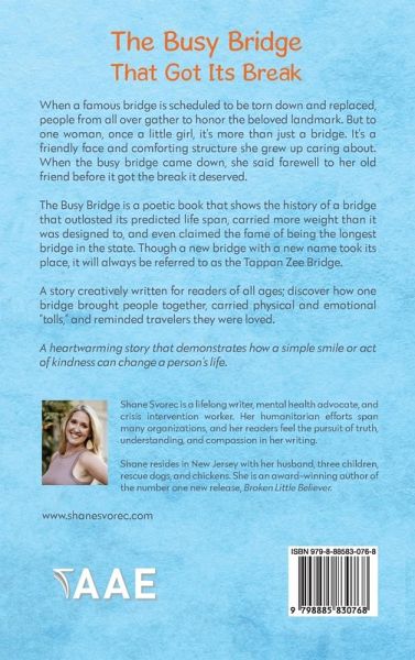 When a famous bridge is scheduled to be torn down and replaced, people from all over gather to honor the beloved landmark. But to one woman, once a little girl, it's more than just a bridge. It's a friendly face and comforting structure she grew up caring about. When the busy bridge came down, she said farewell to her old friend before it got the break it deserved. The Busy Bridge is a poetic book that shows the history of a bridge that outlasted its predicted life span, carried more weight than it was designed to, and even claimed the fame of being the longest bridge in the state. Though a new bridge with a new name took its place, it will always be referred to as the Tappan Zee Bridge. A story creatively written for readers of all ages; discover how one bridge brought people together, carried physical and emotional "tolls," and reminded travelers they were loved. A heartwarming story that demonstrates how a simple smile or act of kindness can change a person's life.