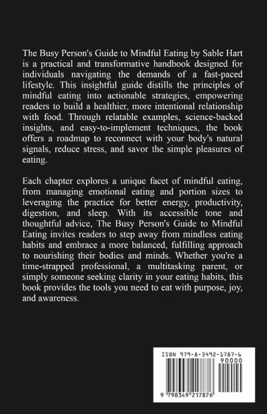 The Busy Person's Guide to Mindful Eating by Sable Hart is a practical and transformative handbook designed for individuals navigating the demands of a fast-paced lifestyle. This insightful guide distills the principles of mindful eating into actionable strategies, empowering readers to build a healthier, more intentional relationship with food. Through relatable examples, science-backed insights, and easy-to-implement techniques, the book offers a roadmap to reconnect with your body's natural signals, reduce stress, and savor the simple pleasures of eating. Each chapter explores a unique facet of mindful eating, from managing emotional eating and portion sizes to leveraging the practice for better energy, productivity, digestion, and sleep. With its accessible tone and thoughtful advice, The Busy Person's Guide to Mindful Eating invites readers to step away from mindless eating habits and embrace a more balanced, fulfilling approach to nourishing their bodies and minds. Whether you're a time-strapped professional, a multitasking parent, or simply someone seeking clarity in your eating habits, this book provides the tools you need to eat with purpose, joy, and awareness.