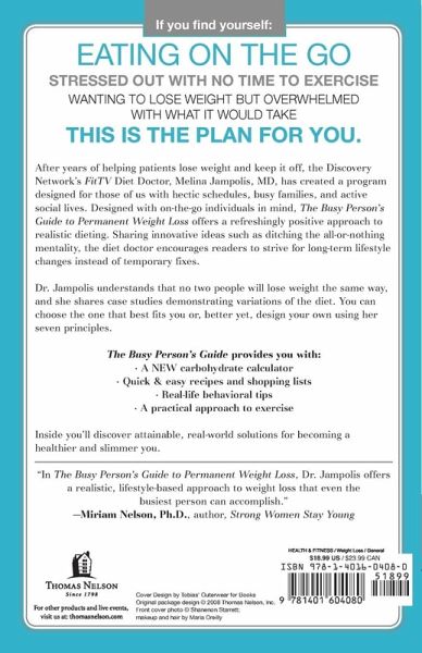 The Busy Person's Guide to Permanent Weight Loss reveals a weight-loss plan busy people can successfully use in the real world. Busy people see to everything and everyone-except themselves. The result is unexpected weight gain. But few people have the time to lose weight. This revolutionary approach to weight loss embraces the hectic lifestyle and provides realistic strategies for staying on target, including: a program that is easily tailored to fit individual dieting needs helpful dining options for eating out healthy, flavorful, and FAST menu ideas for eating in, and time saving strategies to maximize results. No two people lose weight the same way, and busy people need a plan designed for their schedule. Dr. Jampolis has developed variations of the plan that will work with every lifestyle and every schedule. You can even create your own plan by applying her seven principles into a plan that suits your lifestyle.