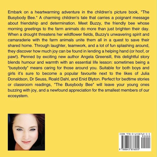Embark on a heartwarming adventure in the children's picture book, "The Busybody Bee." A charming children's tale that carries a poignant message about friendship and determination. Meet Buzzy, the friendly bee whose morning greetings to the farm animals do more than just brighten their day. When a drought threatens her wildflower fields, Buzzy's unwavering spirit and camaraderie with the farm animals unite them all in a quest to save their shared home. Through laughter, teamwork, and a lot of fun splashing around, they discover how much joy can be found in lending a helping hand (or hoof, or paw!). Penned by exciting new author Angela Greensill, this delightful story blends humour and warmth with an essential life lesson: sometimes being a "busybody" means caring for those around you. Suitable for both boys and girls it's sure to become a popular favourite next to the likes of Julia Donaldson, Dr Seuss, Roald Dahl, and Enid Blyton. Perfect for bedtime stories or classroom readings, "The Busybody Bee" will leave your young ones buzzing with joy, and a newfound appreciation for the smallest members of our ecosystem. A perfect gift for birthdays, Christmas, and baby showers. Order your copy today and discover the magic of, 'The Busybody Bee.' With a vibrant background steeped in psychology and a decade-long journey in the human services sector, Angela's career path has taken her from the bustling city of Darwin to the lively arts scene in Brisbane. Her versatile experience, combined with a distinct sense of humour, set the foundation for her unique storytelling style. Angela's foray into writing took root in an unexpected, yet charming, manner. The simple act of crafting amusing tales for her niece sparked a realisation - her stories had the potential to resonate with a broader audience. The core of Angela's work as a children's author is interweaving laughter and learning, ensuring that each tale she spins is not only entertaining but educational. As someone who grew up on a farm in regional Queensland, Angela infuses her experiences into her narratives, enriching them with authenticity and a sense of homegrown wisdom. Her goal? To provide children with a unique storytelling experience - one where each giggle is a step towards a new discovery, and every page turned is a venture into a world that combines the joy of laughter with the thrill of learning.