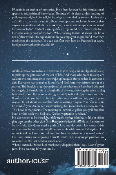 All those who crave to live are welcome to dive deep and indulge their desire to pick up the gems out of the sea of life. And those who want to sleep are welcome to reminisce once they wake up because everyone has to come one day. Everyone has to realize himself and look into the mirror, not at the mirror. This book is a lighthouse for all those whose sails have been doomed by the gale of kismet. It is in the middle of the way, showing the track to the final destination. If you know the right direction, it will come into your path. If you are lost, you have to find it. Either way, it will become part of your voyage. It's all about you and him who is waiting for you. You can't miss it; he won't let you. An eye can see everything, but to see itself, it needs a mirror. This book is that mirror. The meeting is inevitable; either you will find this book or this book will find you. The only question is, when." His doors seem to be closed, but they aren't; neither is his heart. It's our vision that can't see the other side. Since our knowledge blindfolds us, he seems to be invisible. The doors need a push of love and devotion. He wants it this way because he wants to enlighten our souls with love and devotion. He wants us to knock once and ask for him. Isn't that what every beloved wants? He is not sitting and enjoying himself inside; he is making preparations to welcome us. We just need to knock once. When I entered, I found him much more desperate than I was. Now it's your turn. He is waiting for your knock.