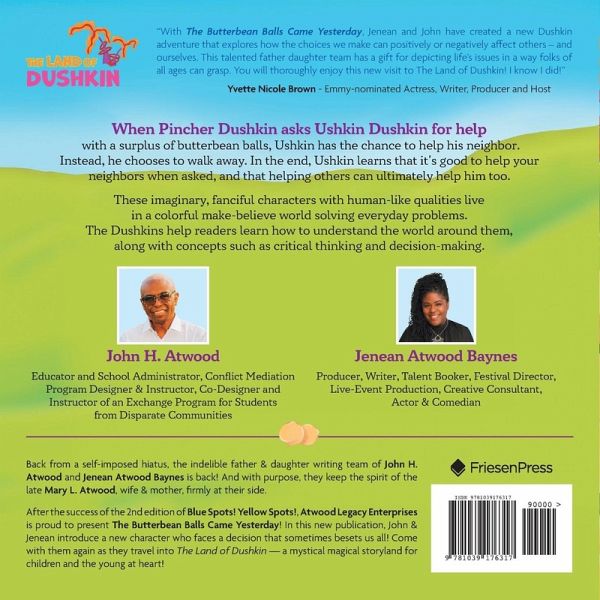 Back from a self-imposed hiatus, the indelible father & daughter writing team of John H. Atwood and Jenean Atwood Baynes is back! And with purpose, they keep the spirit of the late Mary L. Atwood, wife & mother, firmly at their side. After the success of the 2nd edition of Blue Spots! Yellow Spots! Atwood Legacy Enterprises is proud to present The Butterbean Balls Came Yesterday! In this new publication, John & Jenean introduce a new character who faces a decision that sometimes besets us all! Come with them again as they travel into The Land of Dushkin - a mystical magical storyland for children and the young at heart! When Pincher Dushkin asks Ushkin Dushkin for help with a surplus of butterbean balls, Ushkin has the chance to help his neighbor. Instead, he chooses to walk away. In the end, Ushkin learns that it's good to help your neighbors when asked, and that helping others can ultimately help him too. These imaginary, fanciful characters with human-like qualities live in a colorful make-believe world solving everyday problems. The Dushkins help readers learn how to understand the world around them, along with concepts such as critical thinking and decision-making.