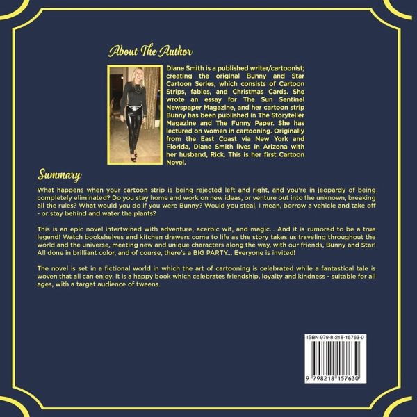 What happens when your cartoon strip is being rejected left and right, and you're in jeopardy of being completely eliminated? Do you stay home and work on new ideas, or venture out into the unknown, breaking all the rules? What would you do if you were Bunny? Would you steal, I mean, borrow a vehicle and take off - or stay behind and water the plants? This is an epic novel intertwined with adventure, acerbic wit, and magic... And it is rumored to be a true legend! Watch bookshelves and kitchen drawers come to life as the story takes us traveling throughout the world and the universe, meeting new and unique characters along the way, with our friends, Bunny and Star! All done in brilliant color, and of course, there's a BIG PARTY... Everyone is invited! The novel is set in a fictional world in which the art of cartooning is celebrated while a fantastical tale is woven that all can enjoy. It is a happy book that celebrates friendship, loyalty, and kindness - suitable for all ages, with a target audience of tweens.