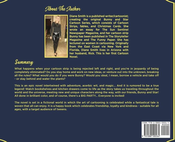 What happens when your cartoon strip is being rejected left and right, and you're in jeopardy of being completely eliminated? Do you stay home and work on new ideas, or venture out into the unknown, breaking all the rules? What would you do if you were Bunny? Would you steal, I mean, borrow a vehicle and take off - or stay behind and water the plants? This is an epic novel intertwined with adventure, acerbic wit, and magic... And it is rumored to be a true legend! Watch bookshelves and kitchen drawers come to life as the story takes us traveling throughout the world and the universe, meeting new and unique characters along the way, with our friends, Bunny and Star! All done in brilliant color, and of course, there's a BIG PARTY... Everyone is invited! The novel is set in a fictional world in which the art of cartooning is celebrated while a fantastical tale is woven that all can enjoy. It is a happy book that celebrates friendship, loyalty, and kindness - suitable for all ages, with a target audience of tweens.