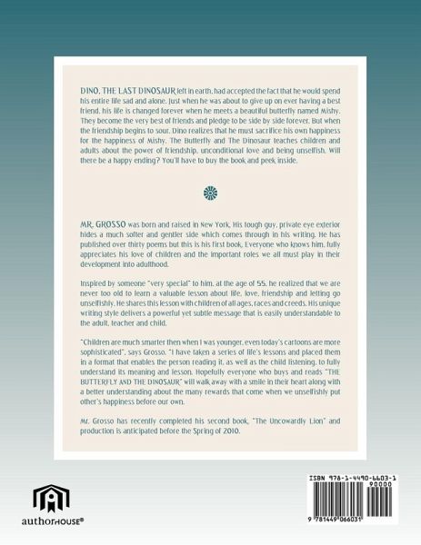 Dino, the last dinosaur left on earth, had sadly accepted the fact that he would spend the rest of his life alone. Just when he was about to give up on ever having a best friend, his life is changed forever when he meets a beautiful butterfly named Mishy. They become the very best of friends and pledge to be side by side forever. But when the friendship begins to sour, Dino realizes that he must sacrifice his own happiness for the happiness of Mishy. "The Butterfly and The Dinosaur" teaches children and adults about the power of friendship, unconditional love and being unselfish. Will there be a happy ending? You'll have to buy the book and peek inside.