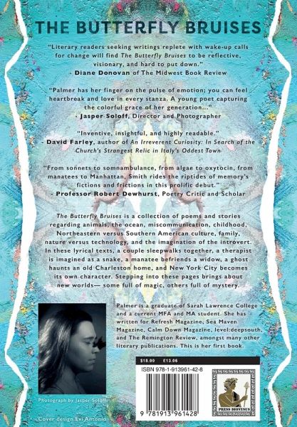 The Butterfly Bruises is a collection of poems and stories regarding animals, the ocean, miscommunication, childhood, Northeastern versus Southern American culture, family, nature versus technology, and the imagination of the introvert. In these lyrical texts, a couple sleepwalks together, a therapist is imagined as a snake, a manatee befriends a widow, a ghost haunts an old Charleston home, and New York City becomes its own character. Stepping into these pages brings about new worlds-some full of magic, others full of mystery.