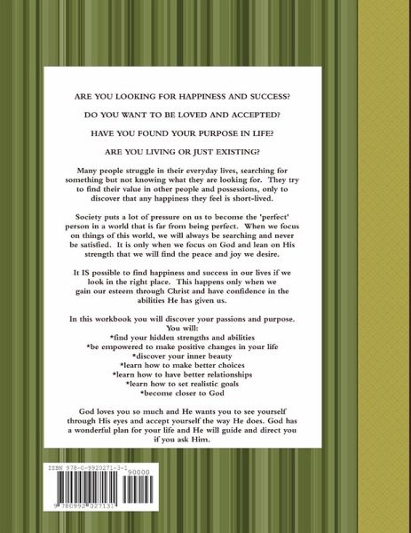 This workbook will help you find your esteem through Christ and discover your God-given abilities and strengths. You will learn how to change your negative self-talk into positive self-talk and fill yourself with positive emotions. You will learn how to use positive affirmations and develop habits that will change your perspective on life. You will learn how to find your true beauty and accept your flaws and imperfections. You will learn how to set and reach your goals.