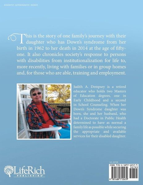 This is the story of one family’s journey with their daughter who has Down’s syndrome from her birth in 1962 to her death in 2014 at the age of fifty-one. It also chronicles society’s response to persons with disabilities from institutionalization for life to, more recently, living with families or in group homes and, for those who are able, training and employment.