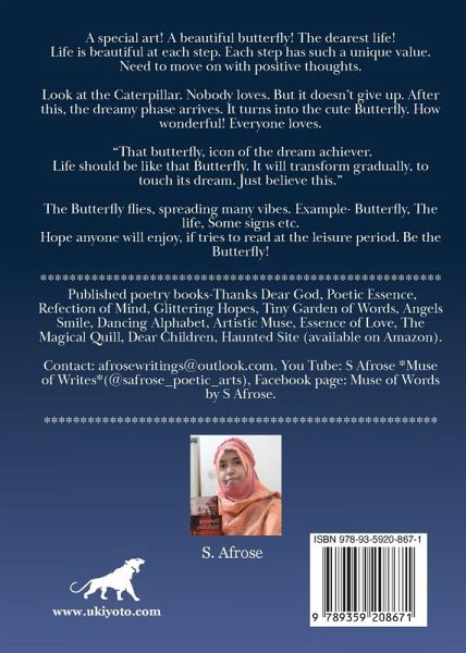 A special art! A beautiful butterfly! The dearest life! Life is beautiful at each step. Each step has such a unique value. Need to move on with positive thoughts. Look at the Caterpillar. Nobody loves. But it doesn't give up. After this, the dreamy phase arrives. It turns into the cute Butterfly. How wonderful! Everyone loves. "That butterfly, icon of the dream achiever. Life should be like that Butterfly. It will transform gradually, to touch its dream. Just believe this." The Butterfly flies, spreading many vibes. Example- Butterfly, The life, Some signs etc. Hope anyone will enjoy, if tries to read at the leisure period. Be the Butterfly!