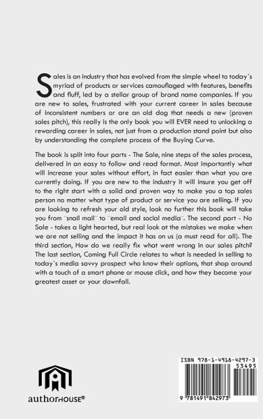 Sales is an industry that has evolved from the simple wheel to today¿s myriad of products or services camouflaged with features, benefits and fluff, led by stellar group of brand name companies. If you are new to sales, frustrated with your current career in sales because of inconsistent numbers or are an old dog that needs a new (proven sales pitch), this really is the only book you will EVER need to unlocking a rewarding career in sales, not just from a production stand point but also by understanding the complete process of the Buying Curve. The book is split into four parts - The Sale, nine steps of the sales process, delivered in an easy to follow and read format. Most importantly what will increase your sales without effort, in fact easier than what you are currently doing. If you are new to the industry it will insure you get off to the right start with a solid and proven way to make you a top sales person no matter what type of industry you are working in. If you are looking to refresh your old style, look no further this book will take you from ¿snail mail¿ to ¿email and social mediä. The second part - No Sale - takes a light hearted, but real look at the mistakes we make when we are not selling and the impact it has on us (a must read for all). The third section, How do we really fix what went wrong in our sales pitch? The last section, Coming Full Circle relates to what is needed in selling to today¿s media savvy prospect who know their options, that shop around with a touch of a smart phone or mouse click, and how they become your greatest asset or your downfall.