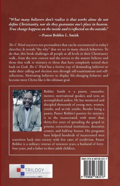 "What many believers don't realize is that works alone do not define Christianity, nor do they guarantee one's place in heaven. True change happens on the inside and is reflected on the outside." -Pastor Bobbie L. Smith The C Word uncovers ten personalities that can be encountered in today's churches. It reveals "the why" that we see in many church behaviors. To do that, this book challenges all people at all levels in their Christianity walk...from the new convert and the novice to the mature believer and those that walk in ministry to those that have completely turned their back on God. The C Word has a furtive way of demanding believers to make their calling and election sure through self-examinations and self-reflection. Motivating believers to display life-changing behavior and become more Christ-like is the ultimate goal.