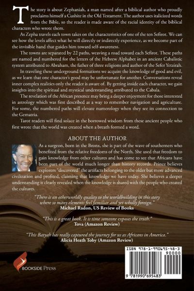 The story is about Zephaniah, a man named after a biblical author who proudly proclaims himself a Cushite in the Old Testament. The author uses italicized words from the Bible, so the reader is made aware of the racial identity of the biblical characters who wrote them. As Zepha travels each town takes on the characteristics of one of the ten Sefirot. We can see how the levels affect what he will directly or indirectly experience, as we become part of the invisible hand that guides him toward self-awareness. The towns are separated by 22 paths, weaving a road toward each Sefirot. These paths are named and numbered for the letters of the Hebrew Alphabet in an ancient Cabalistic system attributed to Abraham, the father of three religions and author of the Sefer Yetzirah. In traveling these underground formations we acquire the knowledge of good and evil, as we learn that one character's good may be unfortunate for another. Conversations reveal inner complex realities only the reader is aware of. By getting inside each character, we gain insights into the spiritual and mystical understanding attributed to the Cabala. The revelation of the African presence may bring a deeper enjoyment for those interested in astrology which was first described as a way to remember navigation and agriculture. For some, the numbered paths will elevate numerology when they see its connection to the Gematria. Tarot readers will find solace in the borrowed wisdom from these ancient people who first wrote that the world was created when a breath formed a word.