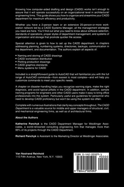 This text provides managers of architecture/engineering firms with advice on how to organize and streamline their computer-aided drafting and design (CADD) departments. Strategies are included for setups ranging from a two-person team to an extensive workstation network led by a CADD Systems Manager. The authors cover software selection, standards of operations, proper styles of department management, and systems of reoganization and storage that promote quicker file access. A chapter on CADD disaster-handling helps users recognize warning signs, make the right diagnosis, and avoid typical pitfalls. A straightforward guide to AutoCAD simplifies use of customized commands to meet specific needs. Sample training programs for engineers and other CADD users make it easy to bring office professionals into the systems. Pros and cons of different workstations layouts, managerial organizations, and plotter choices are thoroughly discussed. CADD graphics standards, menu systems for CADD and CADD workstation distribution are also covered. Numerous illustrations througout clarify key concepts.