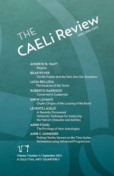 This issue of The CAELi Review brings us new poems sourced by our poetry editor Matt Trease, and six new pieces-on the ancestral roots of the fixed stars, on the many systems and applications of bounds or terms, on Orphic roots and connections to Hellenistic astrology, to an exclusive newly translated piece on the delineation of the bounds, a reflection on the privileges and importance of psychological astrology, and a thorough piece on the application of firdaria, triple progressions (secondary, tertiary, and quaternary) and transits on the horoscope of Martha Stewart.