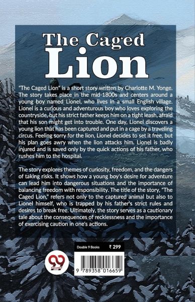 "The Caged Lion" is a short story written by Charlotte M. Yonge. The story takes place in the mid-1800s and centers around a young boy named Lionel, who lives in a small English village. Lionel is a curious and adventurous boy who loves exploring the countryside, but his strict father keeps him on a tight leash, afraid that his son might get into trouble. One day, Lionel discovers a young lion that has been captured and put in a cage by a traveling circus. Feeling sorry for the lion, Lionel decides to set it free, but his plan goes awry when the lion attacks him. Lionel is badly injured and is saved only by the quick actions of his father, who rushes him to the hospital. The story explores themes of curiosity, freedom, and the dangers of taking risks. It shows how a young boy's desire for adventure can lead him into dangerous situations and the importance of balancing freedom with responsibility. The title of the story, "The Caged Lion," refers not only to the captured animal but also to Lionel himself, who is trapped by his father's strict rules and desires to break free. Ultimately, the story serves as a cautionary tale about the consequences of recklessness and the importance of exercising caution in one's actions.