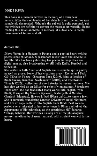 This book is a memoir written in memory of a very dear person. After the sad demise of her elder brother, the author was completely devastated. Although the subject is quite personal, yet the writings are definite to convey the message universally. Hence reading this small anecdote in memory of a dear one is highly recommended to one and all.