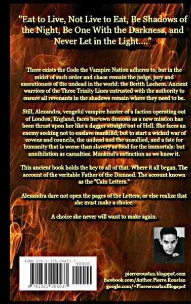 Alexandra Glade, vengeful vampire hunter of a faction operating out of London, England, faces her own demons as a new mission has been thrust upon her like a dagger straight out of Hell. She faces an enemy seeking not to enslave mankind, but to start a wicked war of covens and councils, the undead and the unsullied, and a fate for humanity that is worse than slavery as food for the immortals: but annihilation as casualties. Mankind's extinction as we know it. This ancient book holds the key to all of that. Where it all began. The account of the veritable Father of the Damned. The account known as the "Cain Letters." Alexandra dare not open the pages of the Letters, or else realize that she must make a choice. A choice she never will want to make again.