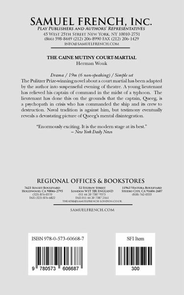 Herman Wouk Full Length, Drama Characters:19 male (6 non-speaking) Simple set The Pulitzer Prize-winning novel about a court martial has been adapted by the author into suspenseful evening of theatre. A young lieutenant is relieved his captain of command in the midst of a typhoon on the grounds that the captain, Queeg is a psychopath in crisis and commanded the ship and its crew to destruction. Naval tradition is against him, but testimony eventually reveals a devastating picture of Queeg's mental disintegration. "Enormously exciting. It is the modern stage at its best." -N.Y. Daily News