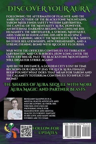 Following the aftermath of Flaunte and the ambush outside of the Blackstone Mountains, Yaron Meek finds safety within Labyrintha, the capital of the Mentality Aura. However, an internal darkness begins to consume his humanity. The Soothsayer, a strong Mentalist, aids Yaron in navigating his new head space while learning about the Mentality Aura. Shifts in other relationships, new friendships, and a strengthening bond with Ricochet flourish. War with the Officers continues to threaten Labyrintha and our heroes. How long until the Officers break past the Blackstone Mountains? Will disaster strike again? And in the distance, a golden city lost in time beckons our group. Has the Luck Aura finally been found? What does that mean for Yaron and the calamity Toterrum continues to inflict on Biome?