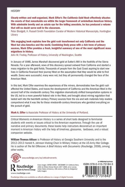 In January of 1848, James Marshall discovered gold at Sutter's Mill in the foothills of the Sierra Nevada. For a year afterward, news of this discovery spread outward from California and started a mass migration to the gold fields. Thousands of people from the East Coast aspiring to start new lives in California financed their journey West on the assumption that they would be able to find wealth. Some were successful, many were not, but they all permanently changed the face of the American West. In this text, Mark Eifler examines the experiences of the miners, demonstrates how the gold rush affected the United States, and traces the development of California and the American West in the second half of the nineteenth century. This migration dramatically shifted transportation systems in the US, led to a more powerful federal role in the West, and brought about mining regulation that lasted well into the twentieth century. Primary sources from the era and web materials help readers comprehend what it was like for these nineteenth-century Americans who gambled everything on the pursuit of gold.