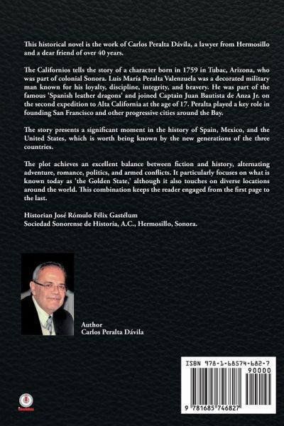 This historical novel is the work of Carlos Peralta Dávila, a lawyer from Hermosillo and a dear friend of over 40 years. The Californios tells the story of a character born in 1759 in Tubac, Arizona, who was part of colonial Sonora. Luis María Peralta Valenzuela was a decorated military man known for his loyalty, discipline, integrity, and bravery. He was part of the famous 'Spanish leather dragons' and joined Captain Juan Bautista de Anza Jr. on the second expedition to Alta California at the age of 17. Peralta played a key role in founding San Francisco and other progressive cities around the Bay. The story presents a significant moment in the history of Spain, Mexico, and the United States, which is worth being known by the new generations of the three countries. The plot achieves an excellent balance between fiction and history, alternating adventure, romance, politics, and armed conflicts. It particularly focuses on what is known today as 'the Golden State, ' although it also touches on diverse locations around the world. This combination keeps the reader engaged from the first page to the last. Historian José Rómulo Félix Gastélum Sociedad Sonorense de Historia, A.C., Hermosillo, Sonora.