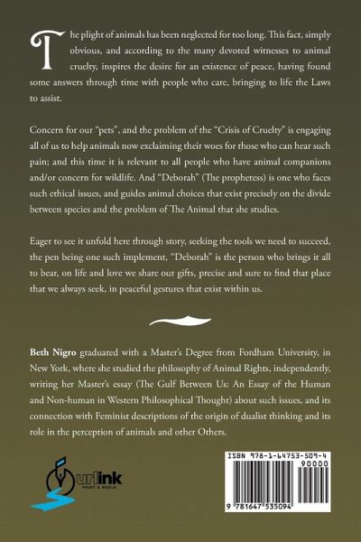 The plight of animals has been neglected for too long. This fact, simply obvious, and according to the many devoted witnesses to animal cruelty, inspires the desire for an existence of peace, having found some answers through time with people who care, bringing to life the Laws to assist. Concern for our "pets", and the problem of the "Crisis of Cruelty" is engaging all of us to help animals now exclaiming their woes for those who can hear such pain; and this time it is relevant to all people who have animal companions and/or concern for wildlife. And "Deborah" (The prophetess) is one who faces such ethical issues, and guides animal choices that exist precisely on the divide between species and the problem of The Animal that she studies. Eager to see it unfold here through story, seeking the tools we need to succeed, the pen being one such implement, "Deborah" is the person who brings it all to bear, on life and love we share our gifts, precise and sure to find that place that we always seek, in peaceful gestures that exist within us.