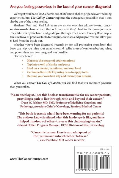 Are you feeling powerless in the face of your cancer diagnosis? We've got your back! Yes, Cancer is one of life's most challenging and overwhelming experiences, but The Call of Cancer explores the outrageous possibility that it can also be one of the most healing. Shariann Tom and Keri Lehmann are cancer coaching pioneers - and cancer survivors - who have written the book they wish they'd had for their own journeys. They take you by the hand and guide you through The Cancer Journey Roadmap, a treasure trove of practical tools, techniques, exercises, and perspectives that allow you to heal from the inside out. Whether you've been diagnosed recently or are still processing years later, this book can help you mine your experience and realize more of your own beauty, value, and power than you ever imagined was possible. Discover how to:Harness the power of your emotions Tap into a well of clarity and peace Heal on a mental, emotional, and soul level Get immediate relief by using easy-to-apply tools Become your own best ally Realize your dreams for now and into the future When you answer The Call of Cancer, you will find that you are more powerful than you realize.