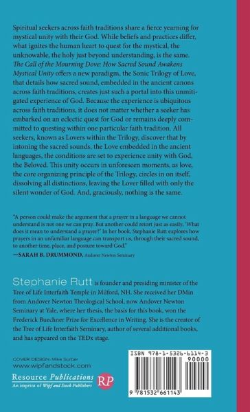 Spiritual seekers across faith traditions share a fierce yearning for mystical unity with their God. While beliefs and practices differ, what ignites the human heart to quest for the mystical, the unknowable, the holy just beyond understanding, is the same. The Call of the Mourning Dove: How Sacred Sound Awakens Mystical Unity offers a new paradigm, the Sonic Trilogy of Love, that details how sacred sound, embedded in the ancient canons across faith traditions, creates just such a portal into this unmitigated experience of God. Because the experience is ubiquitous across faith traditions, it does not matter whether a seeker has embarked on an eclectic quest for God or remains deeply committed to questing within one particular faith tradition. All seekers, known as Lovers within the Trilogy, discover that by intoning the sacred sounds, the Love embedded in the ancient languages, the conditions are set to experience unity with God, the Beloved. This unity occurs in unforeseen moments, as love, the core organizing principle of the Trilogy, circles in on itself, dissolving all distinctions, leaving the Lover filled with only the silent wonder of God. And, graciously, nothing is the same.