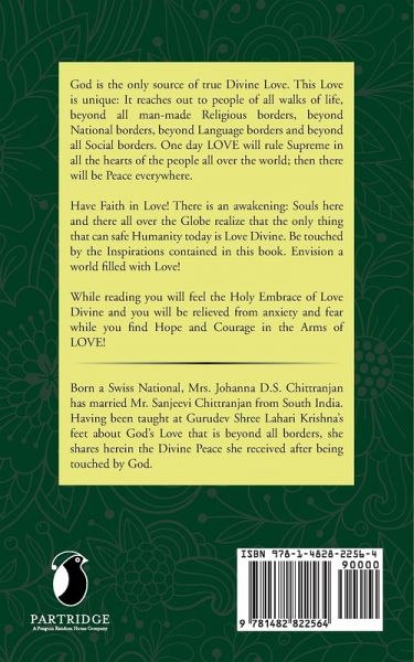 God is the only source of true Divine Love. This Love is unique: It reaches out to people of all walks of life, beyond all man-made Religious borders, beyond National borders, beyond Language borders and beyond all Social borders. One day LOVE will rule Supreme in all the hearts of the people all over the world; then there will be Peace everywhere. Have Faith in Love! There is an awakening: Souls here and there all over the Globe realize that the only thing that can safe Humanity today is Love Divine. Be touched by the Inspirations contained in this book. Envision a world filled with Love! While reading you will feel the Holy Embrace of Love Divine and you will be relieved from anxiety and fear while you find Hope and Courage in the Arms of LOVE!