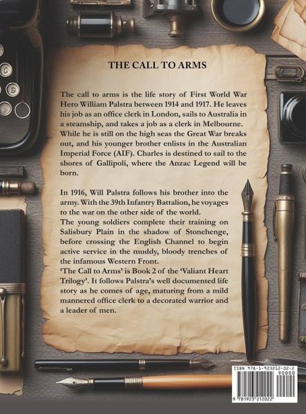 "The Call to Arms" is the life story of First World War hero William Palstra between 1914 and 1917. In 1914 he leaves his job as an office clerk in London, sails to Australia in a steam-ship, and takes a job as a clerk in Melbourne. While he is still on the high seas the Great War breaks out, and his younger brother enlists in the Australian Imperial Force (A.I.F.). Charles is destined to sail to the shores of Gallipoli, where the Anzac legend will be born. Young Will Palstra also enlists. With the 39th Infantry Battalion, he voyages to the war on the other side of the world. The young soldiers complete their training on Salisbury Plain, in the shadow of Stonehenge, before crossing the English Channel to begin active service in the muddy, bloody trenches of the infamous Western Front. "The Call to Arms" is Book #2 of the VALIANT HEART trilogy. It follows Palstra's well-documented life story as he comes of age, maturing from a mild-mannered office clerk to a commissioned officer in the Australian Army.