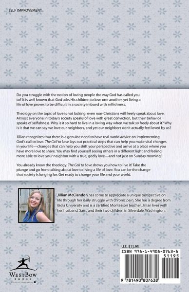 Do you struggle with the notion of loving people the way God has called you to? It is well known that God asks His children to love one another, yet living a life of love proves to be difficult in a society imbued with selfishness. Theology on the topic of love is not lacking; even non-Christians will freely speak about love. Almost everyone in today's society speaks of love with great conviction, but their behavior speaks of selfishness. Why is it so hard to live in a loving way when we talk so freely about it? Why is it that we can say we love our neighbors, and yet our neighbors don't actually feel loved by us? Jillian recognizes that there is a genuine need to have real-world advice on implementing God's call to love. The Call to Love lays out practical steps that can help you make vital changes in your life-changes that can help you shift your perspective and arrive at a place where you have more love to share. You may find yourself seeing others in a different light and feeling more able to love your neighbor with a true, godly love-and not just on Sunday morning! You already know the theology. The Call to Love shows you how to live it! Take the plunge and go from talking about love to living a life of love. You can be the change that society is longing for. Get ready to change your life and your world.