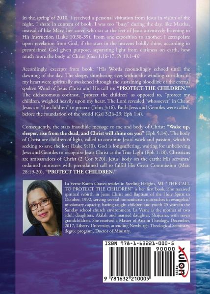 In the spring of 2010, I received a personal visitation from Jesus in vision of the night. I share in content of book, I was too "busy" during the day, like Martha, instead of like Mary, her sister, who sat at the feet of Jesus attentively listening to His instruction (Luke 10:38-39). From one exposition to another, I extrapolate upon revelation from God, if the stars in the heavens boldly shine, according to preordained God given purpose, separating light from darkness on earth, how much more the body of Christ (Gen 1:16-17; Ps 19:1-4)?Accordingly, excerpts from book: "His Words resoundingly echoed until the dawning of the day. The sleepy, slumbering eyes within the winding corridors of my heart were spiritually awakened through the sustaining bloodline of the eternal spoken Word of Jesus Christ and His call to: "PROTECT THE CHILDREN."' The dichotomous contrast, "protect the children" as opposed to, "protect my children, weighed heavily upon my heart. The Lord revealed "whosoever" in Christ Jesus are "the children" to protect (John 3:16). Both Jews and Gentiles were called, before the foundation of the world (Gal 3:26-29; Eph 1:4).Consequently, the stars inaudible message to me and body of Christ: "Wake up, sleeper, rise from the dead, and Christ will shine on you" (Eph 5:14). The body of Christ are children of light, called to continue Jesus' work and passion, which is seeking to save the lost (Luke 9:10). God is longsuffering, waiting for unbelieving Jews and Gentiles to recognize Jesus Christ as the True Light (Eph 1:18). Christians are ambassadors of Christ (2 Cor 5:20), Jesus' body on the earth; His servants/ordained ministers with preordained call to fulfill His Great Commission (Matt 28:19-20). "PROTECT THE CHILDREN." La Verne Karen Graves resides in Sterling Heights, MI. "THE CALL TO PROTECT THE CHILDREN" is her first book. She received spiritual rebirth in Jesus Christ and Baptism of the Holy Spirit in October, 1992, serving several humanitarian outreaches in evangelist/missionary capacity, having taught children and youth 25 years in the Sunday school church environment. La Verne is the mother of two adult daughters, Akilah and married daughter, Shajuana, with seven grandchildren. She received a Master of Arts in Theology, December, 2017, Liberty University, attending Newburgh Theological Seminary, degree program, Doctor of Ministry.La Verne Karen Graves resides in Sterling Heights, MI. "THE CALL TO PROTECT THE CHILDREN" is her first book. She received spiritual rebirth in Jesus Christ and Baptism of the Holy Spirit in October, 1992, serving several humanitarian outreaches in evangelist/missionary capacity, having taught children and youth 25 years in the Sunday school church environment. La Verne is the mother of two adult daughters, Akilah and married daughter, Shajuana, with seven grandchildren. She received a Master of Arts in Theology, December, 2017, Liberty University, attending Newburgh Theological Seminary, degree program, Doctor of Ministry.