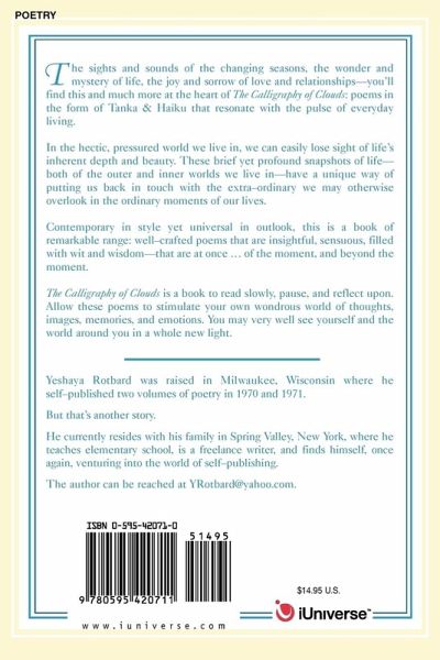 The sights and sounds of the changing seasons, the wonder and mystery of life, the joy and sorrow of love and relationships-you'll find this and much more at the heart of The Calligraphy of Clouds: poems in the form of Tanka & Haiku that resonate with the pulse of everyday living. In the hectic, pressured world we live in, we can easily lose sight of life's inherent depth and beauty. These brief yet profound snapshots of life-both of the outer and inner worlds we live in-have a unique way of putting us back in touch with the extra-ordinary we may otherwise overlook in the ordinary moments of our lives. Contemporary in style yet universal in outlook, this is a book of remarkable range: well-crafted poems that are insightful, sensuous, filled with wit and wisdom-that are at once . of the moment, and beyond the moment. The Calligraphy of Clouds is a book to read slowly, pause, and reflect upon. Allow these poems to stimulate your own wondrous world of thoughts, images, memories, and emotions. You may very well see yourself and the world around you in a whole new light.