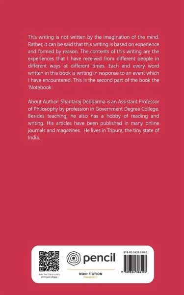 This writing is not written by the imagination of the mind. Rather, it can be said that this writing is based on experience and formed by reason. The contents of this writing are the experiences that I have received from different people in different ways at different times. Each and every word written in this book is writing in response to an event which I have encountered. This is the second part of the book the 'Notebook'. About Author: Shantaraj Debbarma is an Assistant Professor of Philosophy by profession in Government Degree College. Besides teaching, he also has a hobby of reading and writing. His articles have been published in many online journals and magazines. He lives in Tripura, the tiny state of India.
