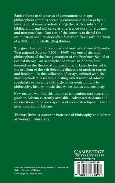 The great German philosopher and aesthetic theorist Theodor Wiesengrund Adorno (1903-69) was one of the main philosophers of the first generation of the Frankfurt School of critical theory. An accomplished musician, Adorno first focused on the theory of culture and art. Later he turned to the problem of the self-defeating dialectic of modern reason and freedom. In this collection of essays, imbued with the most up-to-date research, a distinguished roster of Adorno specialists explore the full range of his contributions to philosophy, history, music theory, aesthetics and sociology. New readers will find this the most convenient and accessible guide to Adorno currently available. Advanced students and specialists will find a conspectus of recent developments in the interpretation of Adorno.