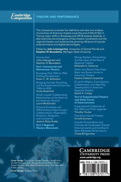 Introduction Julia Listengarten and Stephen Di Benedetto; Part I. Commercial and Mainstream Theatre: 1. Broadway post-1945 to 1960: shifting perspectives Susan C. W. Abbotson; 2. Bridging the gap: Broadway and the experimental from the 1960s to 2020 Cindy Rosenthal; 3. What's inside? Collaborative relationships at the heart of the American musical Laura MacDonald; 4. Shaping Broadway and off-Broadway plays through collaborations: playwrights, directors, designers, and companies Jessica Silsby Brater; Part II. Regional Theatre Movement: 5. Money matters: dismantling the narrative of the rise of regional theatre Elizabeth A. Osborne; 6. When and where they enter: black and brown voices in American theatre Faedra Chatard Carpenter; 7. El jardín mágico: commissions, collaboration, and new play development in American regional theatre David A. Crespy; Part III. Experimental Theatre and Other Forms of Entertainment: 9. Post-avant-garde theatre Arnold Aronson; 10. Populist provocations and commercial cavalcades: popular entertainments and the rise of mass mediated performance Chase Bringardner.