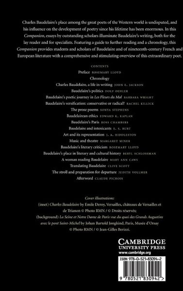 Charles Baudelaire's place among the great poets of the Western world is undisputed, and his influence on the development of poetry since his lifetime has been enormous. In this Companion, essays by outstanding scholars illuminate Baudelaire's writing both for the lay reader and for specialists. In addition to a survey of his life and a study of his social context, the volume includes essays on his verse and prose, analyzing the extraordinary power and effectiveness of his language and style, his exploration of intoxicants like wine and opium, and his art and literary criticism. The volume also discusses the difficulties, successes and failures of translating his poetry and his continuing power to move his readers. Featuring a guide to further reading and a chronology, this Companion provides students and scholars of Baudelaire and of nineteenth-century French and European literature with a comprehensive and stimulating overview of this extraordinary poet.