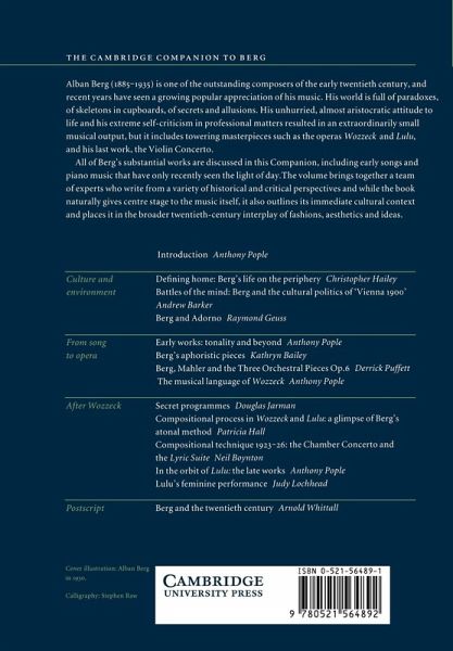 Chronology Introduction Part I. Culture and Environment: 1. Defining home: Berg's life on the periphery Christopher Hailey 2. Battles of the mind: Berg and the cultural politics of 'Vienna 1900' Andrew Barker 3. Berg and Adorno Raymond Geuss Part II. From Song to Opera: 4. Early works: tonality and beyond Anthony Pople 5. Berg's aphoristic pieces Kathryn Bailey 6. Berg, Mahler and the Three Orchestral Pieces, Op.6 Derrick Puffett 7. The musical language of Wozzeck Anthony Pople Part III. After Wozzeck: 8. Secret programmes Douglas Jarman 9. Compositional process in Wozzeck and Lulu: a glimpse of Berg's atonal method Patricia Hall 10. Compositional technique 1923-6: the Chamber Concerto and the Lyric Suite Neil Boynton 11. In the orbit of Lulu: the late works Anthony Pople 12. Lulu's feminine performance Judy Lochhead Part IV. Postscript: Berg and the twentieth century Arnold Whittall.