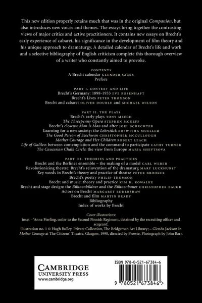 A Brecht calendar Glendyr Sacks; Preface; Part I. Context and Life: 1. Brecht's Germany: 1898-1933 Eve Rosenhaft; 2. Brecht's Lives Peter Thomson; 3. Brecht and cabaret Oliver Double and Michael Wilson; Part II. The Plays: 4. Brecht's early plays Tony Meech; 5. The Threepenny Opera Stephen McNeff; 6. Brecht's clowns: Man is Man and after Joel Schechter; 7. Learning for a new society: the Lehrstück Roswitha Mueller; 8. The Good Person of Szechwan Christopher McCullough; 9. Mother Courage and Her Children Robert Leach; 10. Life of Galileo: between contemplation and the command to participate Catherine Turner; 11. The Caucasian Chalk Circle: the view from Europe Maria Shevtsova; Part III. Theories and Practices: 12. Brecht and the Berliner ensemble - the making of a model Carl Weber; 13. Revolutionising theatre: Brecht's reinvention of the dramaturgy Mary Luckhurst; 14. Key words in Brecht's theory and practice of theatre Peter Brooker; 15. Brecht's poetry Philip Thomson; 16. Brecht and music: theory and practice Kim H. Kowalke; 17. Brecht and stage design: the Bühnenbuildner and the Bühnenbauer Christopher Baugh; 18. Actors on Brecht Margaret Eddershaw; 19. Brecht and film Martin Brady; Bibliography.