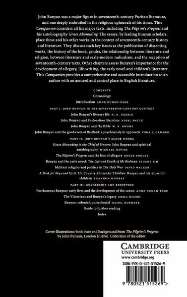 Notes on contributors List of abbreviations Note on the text Chronology Introduction Anne Dunan-Page Part I. John Bunyan in his Seventeenth-Century Context: 1. John Bunyan's literary life N. H. Keeble 2. John Bunyan and Restoration literature Nigel Smith 3. John Bunyan and the Bible W. R. Owens 4. John Bunyan and the goodwives of Bedford: a psychoanalytic approach Vera J. Camden Part II. John Bunyan's Major Works: 5. Grace Abounding to the Chief of Sinners: John Bunyan and spiritual autobiography Michael Davies 6. The Pilgrim's Progress and the line of allegory Roger Pooley 7. Bunyan and the early novel: The Life and Death of Mr. Badman Stuart Sim 8. Militant religion and politics in The Holy War David Walker 9. A Book for Boys and Girls: Or, Country Rhimes for Children: Bunyan and literature for children Shannon Murray Part III. Readership and Reception: 10. Posthumous Bunyan: early lives and the development of the canon Anne Dunan-Page 11. The Victorians and Bunyan's legacy Emma Mason 12. Bunyan: colonial, postcolonial Isabel Hofmeyr Further reading Index.