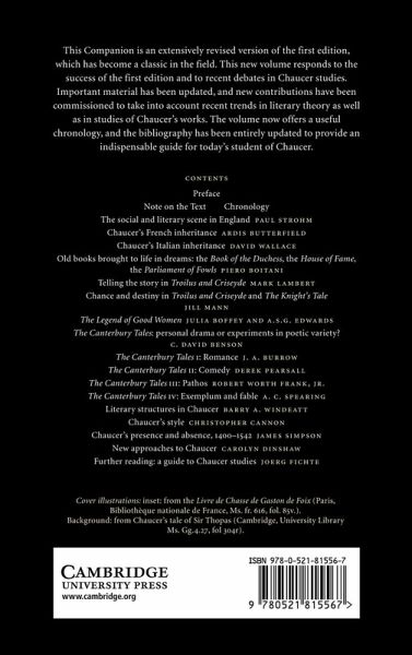 1. The social and literary scene in England Paul Strohm 2. Chaucer's French inheritance Ardis Butterfield 3. Chaucer's Italian inheritance David Wallace 4. Old books brought to life in dreams: the Book of the Duchess, the House of Fame, the Parliament of Fowls Piero Boitani 5. Telling the story in Troilus and Criseyde Mark Lambert 6. Chance and destiny in Troilus and Criseyde and The Knight's Tale Jill Mann 7. The Legend of Good Women Julia Boffey and A. S. G. Edwards 8. The Canterbury Tales: personal drama or experiments in poetic variety? C. David Benson 9. The Canterbury Tales I: Romance J. A. Burrow 10. The Canterbury Tales II: Comedy Derek Pearsall 11. The Canterbury Tales III: Pathos Robert Worth Frank, Jr. 12. The Canterbury Tales IV: Exemplum and fable A. C. Spearing 13. Literary structures in Chaucer Barry A. Windeatt 14. Chaucer's style Christopher Cannon 15. Chaucer's presence and absence, 1400-1542 James Simpson 16. New approaches to Chaucer Carolyn Dinshaw 17. Further reading: a guide to Chaucer studies Joerg Fichte.