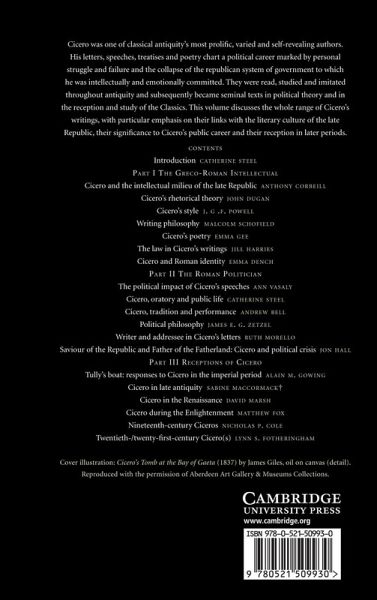 Introduction Catherine Steel Part I. The Greco-Roman Intellectual: 1. Cicero and the intellectual milieu of the late Republic Anthony Corbeill 2. Cicero's rhetorical theory John Dugan 3. Cicero's style J. G. F. Powell 4. Writing philosophy Malcolm Schofield 5. Cicero's poetry Emma Gee 6. The law in Cicero's writings Jill Harries 7. Cicero and Roman identity Emma Dench Part II. The Roman Politician: 8. The political impact of Cicero's speeches Ann Vasaly 9. Cicero, oratory, and public life Catherine Steel 10. Cicero, tradition, and performance Andrew Bell 11. Political philosophy James E. G. Zetzel 12. Writer and addressee in Cicero's letters Ruth Morello 13. Saviour of the Republic and Father of the Fatherland: Cicero and political crisis Jon Hall Part III. Receptions of Cicero: 14. Tully's boat: responses to Cicero in the imperial period Alain M. Gowing 15. Cicero in late antiquity Sabine MacCormack 16. Cicero in the Renaissance David Marsh 17. Cicero during the Enlightenment Matthew Fox 18. Nineteenth-century Ciceros Nicholas P. Cole 19. Twentieth/twenty-first-century Cicero(s) Lynn S. Fotheringham.